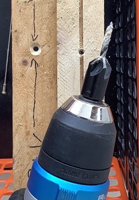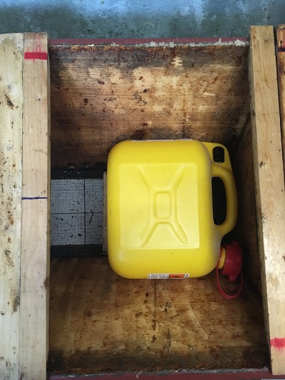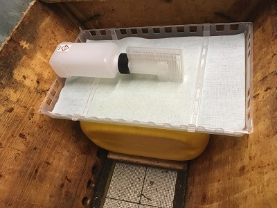 Speichen werden mit kurzem Bolzenschneider eingekürztWabe mit (noch) sichtbaren SpeichenstabilisatorenBohrer mit VersenkerVarroabehandlung mit Reservekanister als Raumverkleinerer im Leerraum der Beute Durch die Verwendung eines Reservekanistern kann ein Nassenheider Verdunster Professional in der Oberträgerbeute eingesetzt werden.
