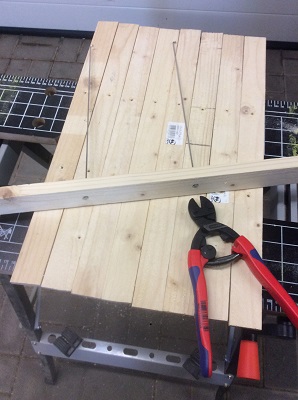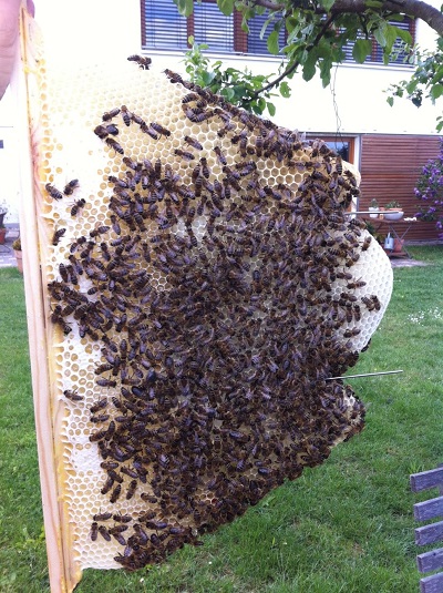 Imkern ohne Wabenabrisse mit Oberträgern. Durch die Verwendung von Fahrradspeichen als Stabilisatoren sind die Oberträgerwaben genauso sicher und leicht zu handhaben, wie Waben in Rähmchen. Die Edelstahlspeichen können ein Imkerleben lang wiederverwendet werden. Durch die Speichenköpfe können die Speichen einfach und sicher fixiert werden.